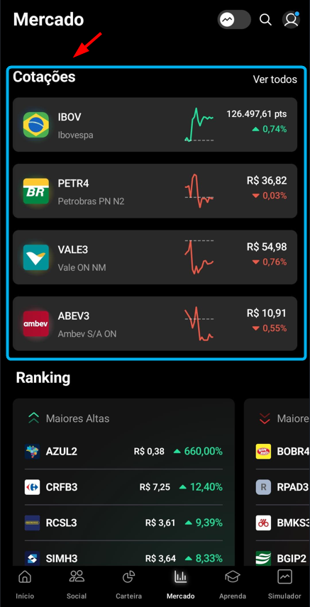 Em Ranking é possível acompanhar os ativos mais negociados, os que tiveram maiores altas e os que tiveram maiores baixas: